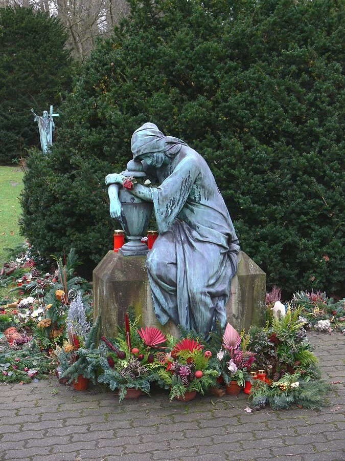 In unmittelbarer Nähe der Kapelle 2 befindet sich ein anonymer Urnenhain. Zentral auf diesem Gelände befindet sich diese Plastik einer trauernden Frau.