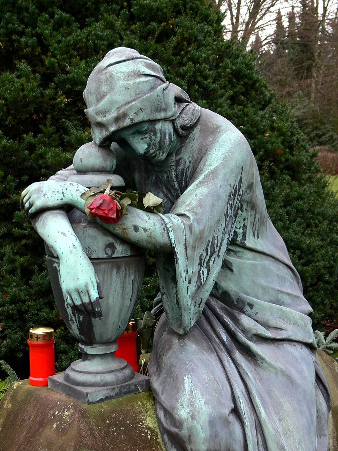 Trauernde Frau am anonymen Urnenhain