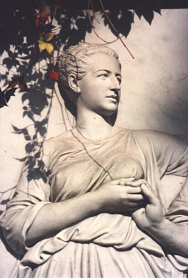 Dieses Photo zeigt einen Ausschnitt aus einer monumentalen Grabanlage, deren Mitte aus einer lebensgroßen Darstellung des Ehepaares besteht, (hier ein Portrait der Ehefrau). |