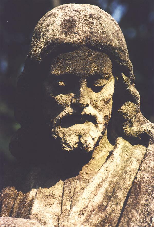 Detail einer relativ kleinen, schon etwas verwitterten Jesus-Darstellung. Sie steht an einem der Hauptgänge, die von der Waldstraße zur Kapelle 7 führen. |
