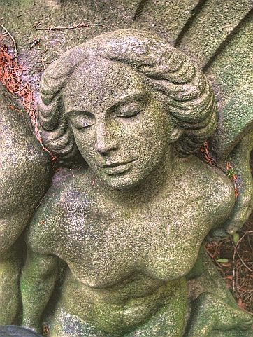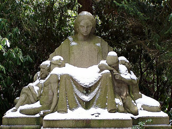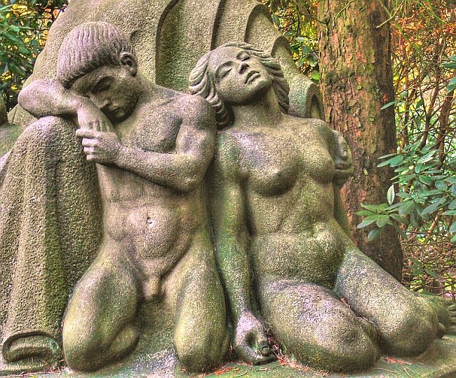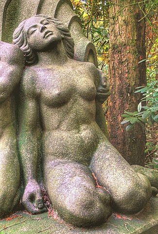 Die monumentale, sitzende Figur symbolisiert Mutter Erde, sie ist symmetrisch aufgebaut, was Körperhaltung, Haartracht und Faltenwurf angeht. Rechts und links befindet sich, entsprechend kleiner, jeweils ein schlafendes, nacktes Paar, von denen in der folgenden Abbildung eines zu sehen ist. |