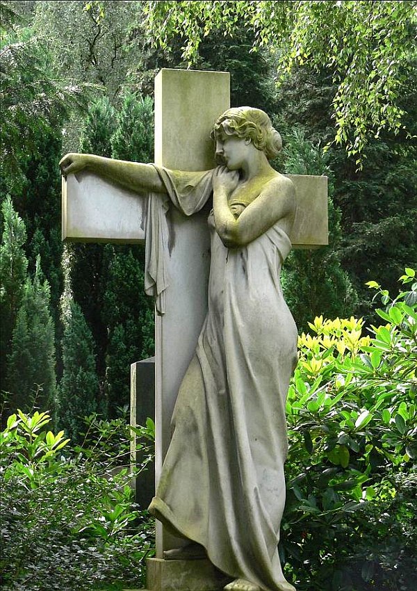 Diese sehr schöne Darstellung einer trauernden Frau an einem großen Kreuz habe ich diverse Male aufsuchen müssen, bis mir ein relativ zufriedenstellendes Foto gelungen ist. Je nach Jahreszeit und Lichtverhältnissen stellt der Hintergrund fotografisch ein ernsthaftes Problem dar - hinzu kommt, daß man genau in südlicher Richtung fotografieren muß, so daß sich das Licht gerade an sonnigen Tagen als äußerst problematisch erweist. |