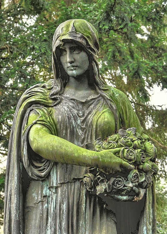Auch diese Skulptur gehört zum historischen Teil des Ehrenfriedhofs - im Original ist das Gesicht der Frau viel dunkler, fast schwarz. Ich habe hier mit Aufhellungs-Techniken gearbeitet, damit man vom Gesicht, aber auch von den übrigen Teilen der Skulptur einen besseren Eindruck erhält. |