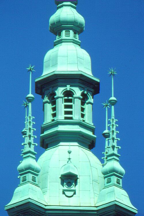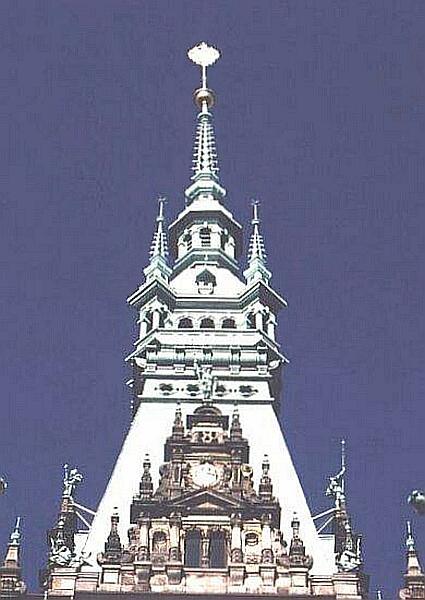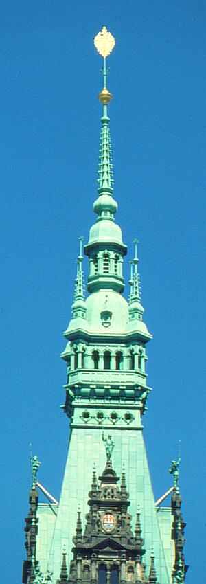 Dieses Photo zeigt die alleroberste Spitze des Hamburger Rathauses.