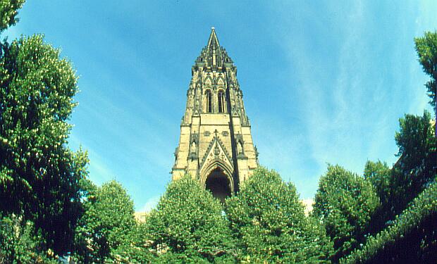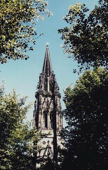 Noch einmal der Turm der Nicolaikirche, diesmal von den Bäumen