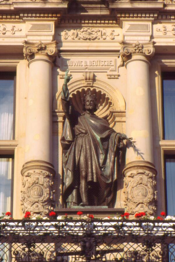 Statue Ludwigs des Deutschen auf dem Balkon eines Seitenflügels