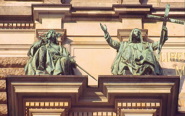 Figuren über den Säulen beim Standbild Karls des Großen