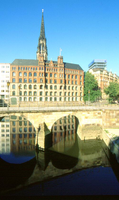 im Vordergrund Spiegelungen im Nikolaifleet )